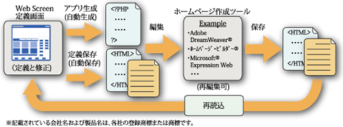 従って、Web Screenでアプリケーション作成後のHTMLをホームページ作成ツールで修正して、再度Web Screenからアプリケーションを再作成できます。